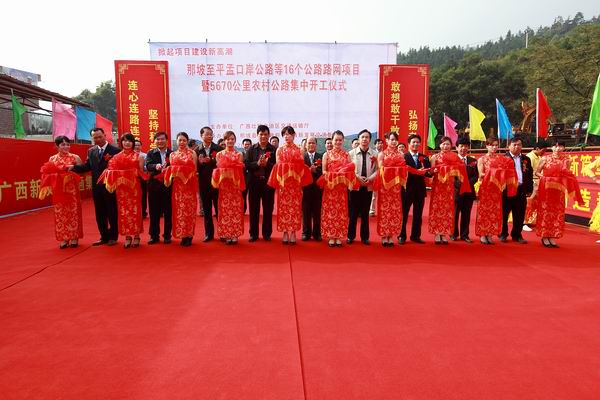 為貫徹落實(shí)自治區(qū)黨委、政府在全區(qū)掀起項(xiàng)目建設(shè)新高潮的決策部署,沖刺第四季度,完成全年公路建設(shè)目標(biāo)任務(wù),自治區(qū)交通運(yùn)輸廳于11月3日舉行全區(qū)公路路網(wǎng)改造項(xiàng)目集中開(kāi)工儀式。由集團(tuán)公司承辦的分會(huì)場(chǎng)——那坡至平孟口岸公路等16個(gè)公路路網(wǎng)項(xiàng)目暨5670公里農(nóng)村公路集中開(kāi)工儀式在百色市那坡縣德隆鄉(xiāng)隆重舉行。自治區(qū)交通運(yùn)輸廳紀(jì)檢組長(zhǎng)、廳黨組成員朱名勝,百色市市委常委、政法委書(shū)記周武紅,市人大常委會(huì)黨組成員黃五同,集團(tuán)公司黨委書(shū)記、董事長(zhǎng)朱堅(jiān)和、總經(jīng)理李定倫、黨委副書(shū)記張友坐、副總經(jīng)理劉明洪、總工程師覃炳賢,自治區(qū)公路管理局、百色市公路管理局、交通運(yùn)輸局、那坡縣四家班子、集團(tuán)公司直屬各單位領(lǐng)導(dǎo)及有關(guān)部門(mén)負(fù)責(zé)人等出席開(kāi)工儀式。