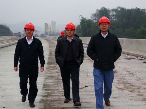 集團(tuán)公司朱堅(jiān)和董事長(左一)、李定倫總經(jīng)理(右一)視察永寧河大橋施工現(xiàn)場(chǎng)