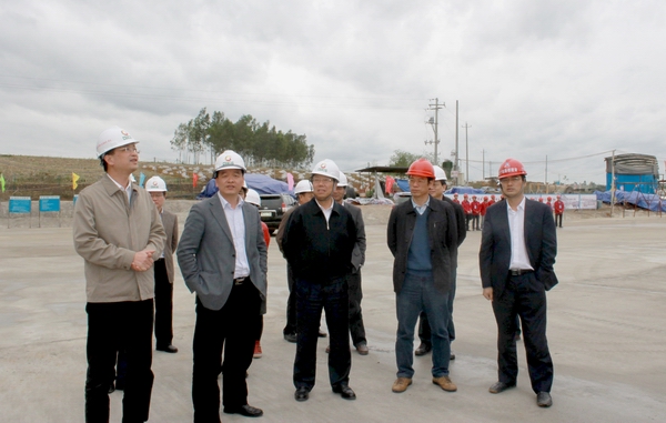 圖為:交通運(yùn)輸廳副廳長(zhǎng)梁毅(右二)、崇左市委書記趙樂(lè)秦(右三)、崇左市副市長(zhǎng)張鴻(左一)在項(xiàng)目現(xiàn)場(chǎng)檢查調(diào)研