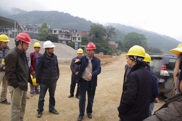 圖為集團(tuán)公司總經(jīng)理李定倫(圖中)、總工程師覃炳賢(右二)在那平路項(xiàng)目施工現(xiàn)場(chǎng)指導(dǎo)工作