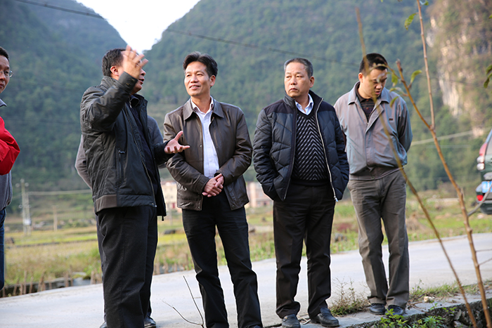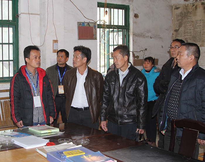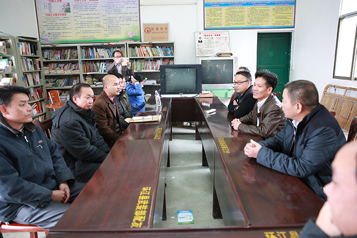集團公司朱堅和董事長(左三)、張友坐副書記(右一)聽取駐村”第一書記“梁義寬匯報工作。 在相堯村、豹山村、才帛村,朱堅和董事長分別與當?shù)劓?zhèn)、村干部以及覃獻康、梁義寬、蔣博三位派駐農(nóng)村“第一書記”和扶貧工作隊隊員進行親切交談,詳細詢問“第一書記”工作、生活情況,并聽取了“第一書記”關于幫扶村的黨建及村集體經(jīng)濟發(fā)展情況匯報。得知目前各駐村書記及扶貧工作隊員已經(jīng)完成精準扶貧入戶摸底調(diào)查時,朱堅和董事長對“第一書記”到村以來,深入調(diào)查走訪,積極幫助村里理思路、定規(guī)劃、辦實事,表示充分肯定。