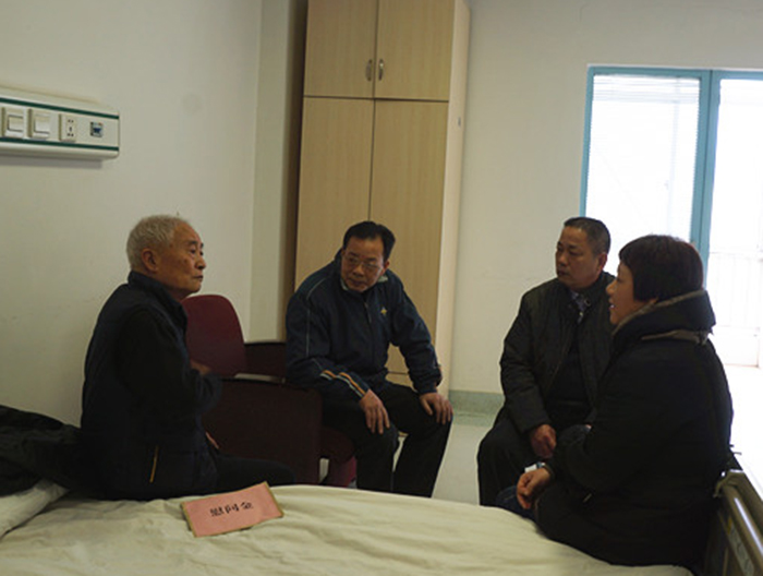 集團(tuán)公司黨委副書記、工會主席張友坐(右二),總工程師覃炳賢(左二)到醫(yī)院看望慰問患病住院的老同志。