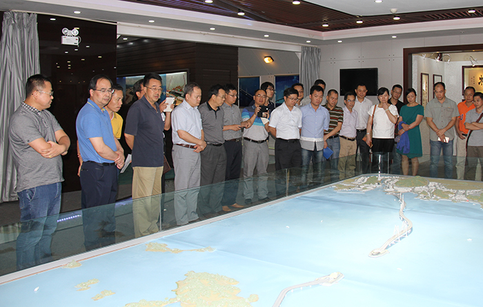 在港珠澳大橋管理局展廳,管理局蘇權(quán)科總工程師向考察團(tuán)介紹了港珠澳大橋建設(shè)背景、工程概況、技術(shù)難點(diǎn)、工程進(jìn)展等情況。集團(tuán)公司學(xué)習(xí)考察人員就工程建設(shè)管理模式、防災(zāi)減災(zāi)設(shè)計、耐久性設(shè)計、沉管對接方案、人工島筑島工藝等問題與大橋項(xiàng)目管理人員進(jìn)行了探討交流。