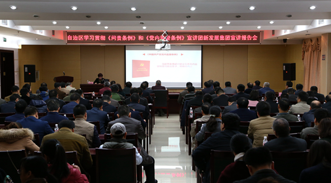2017年2月24日上午,自治區(qū)學(xué)習(xí)貫徹《中國共產(chǎn)黨問責(zé)條例》《中國共產(chǎn)黨黨內(nèi)監(jiān)督條例》宣講團(tuán)到集團(tuán)公司舉行宣講報(bào)告會(huì),自治區(qū)紀(jì)委宣傳部部長陳柳青作宣講報(bào)告,集團(tuán)公司黨委副書記、副董事長、總經(jīng)理唐咸秋主持會(huì)議。