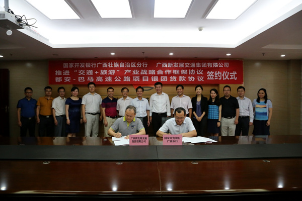 6月9日,集團公司與國家開發(fā)銀行廣西分行在南寧簽訂戰(zhàn)略合作框架協(xié)議。集團公司黨委書記、董事長朱堅和,黨委副書記、副董事長、總經(jīng)理唐咸秋,黨委委員、總會計師鄧遠志,國家開發(fā)銀行廣西分行黨委書記、行長謝志軍,副行長呂軍等領(lǐng)導(dǎo)出席簽約儀式。簽約前,雙方進行了友好會談,雙方重點圍繞賀州至巴馬高速公路、融水至河池高速公路、國省干線公路及沿線地區(qū)的“交通+旅游”項目開展深度戰(zhàn)略合作等方面進行了深入的交流與探討,并達成了一致共識。座談會后,唐咸秋與呂軍分別代表雙方簽訂戰(zhàn)略合作框架協(xié)議。雙方有關(guān)部門負責人參加簽約儀式。(集團公司 投資改革發(fā)展部)