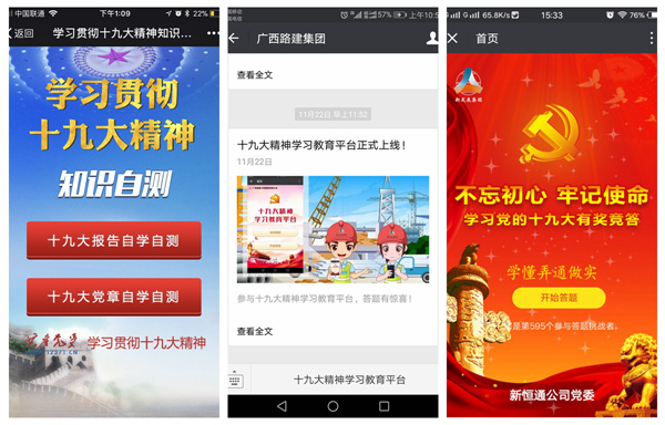 而廣西路建集團、新恒通公司等直屬企業(yè)微信公眾號也開辟了十九大精神學習教育平臺,開創(chuàng)性地把知識性較強的黨建知識競答與趣味性十足的搶紅包結(jié)合到一起,寓教于樂,大大激發(fā)了廣大黨員干部和企業(yè)員工的學習積極性。