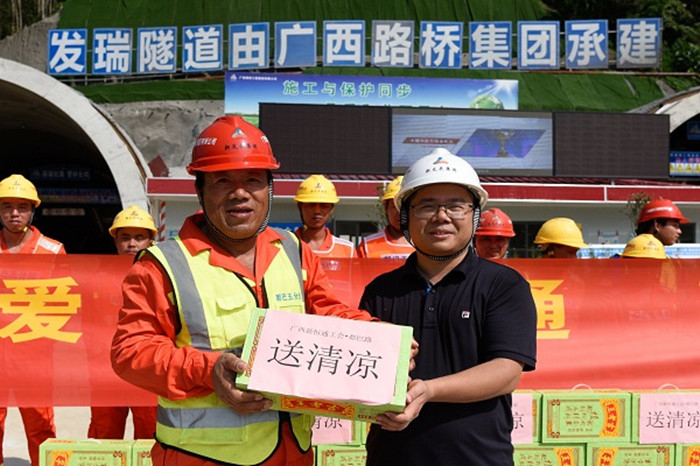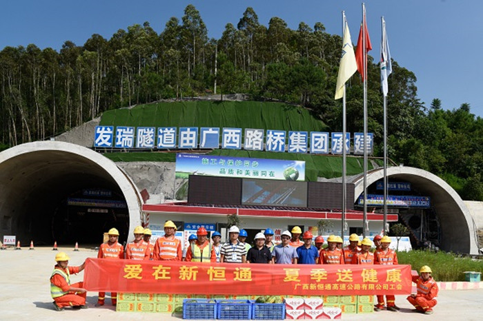 8月14-15日,新恒通公司黨委副書記、副董事長、總經(jīng)理、總工程師藍(lán)日彥,公司黨委委員、常務(wù)副總經(jīng)理蘇偉勝,公司黨委委員、副總經(jīng)理、都巴高速指揮部黨支部書記、指揮長陸原恩一行到都巴高速五分部發(fā)瑞隧道出口、三分部紅水河特大橋施工現(xiàn)場,深入施工一線慰問都巴高速六個(gè)分部的一線工人,為他們送去了防暑降溫慰問品,表達(dá)了對(duì)一線工人的關(guān)懷,感謝他們炎炎夏日下的堅(jiān)守。
